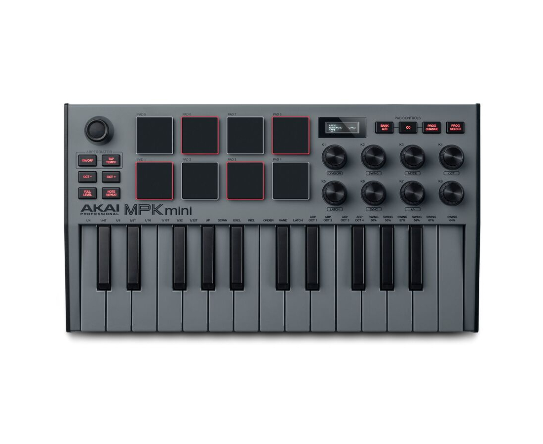 MIDI клавиатура-контроллер Akai MPK MINI 3; 25 компактных клавиш с динамической экспрессией и точной артикуляцией; Яркий OLED дисплей для визуальной обратной связи; 8 пэдов MPC с функциями назначения 4 банков, Note Repeat и Full Level; 8 бесконечных кнобов; 4-направленный джойстик для управления питчем и модуляцией; Plug-and-Play класс-совместимость; Встроенный арпеджиатор; Вход для педали сустейна; Комплект софта: MPC Beats, AIR Hybrid, Mini Grand and Velvet и отобранные MPC Beats из пэков расширений MPC Expansion; Цвет: классический черный; Ширина: 318 мм; Глубина: 181 мм; Высота: 44 мм; Вес: 0,75 кг