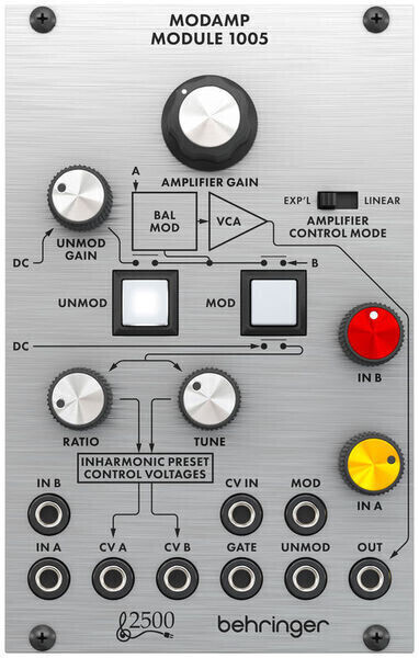 Behringer Modamp Module 1005- Eurorack module- Ringmodulator and VCA- 2 ignal inputs with level controls- MOD and UNMOD modes for selecting Ringmodulator or Amplifier operation- 2 adjustable CV outputs for controlling external Oscillators- Gate inputs to switch modulation modes- build-in VCA with gain control knob and selector switch for linear or exponential response- power consumption: 60mA (+12V) / 45mA (-12V)- width: 16 HP- depth: 43mm