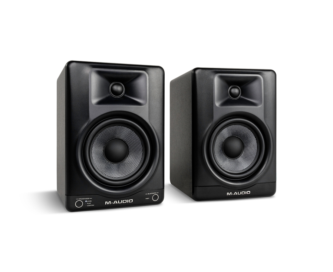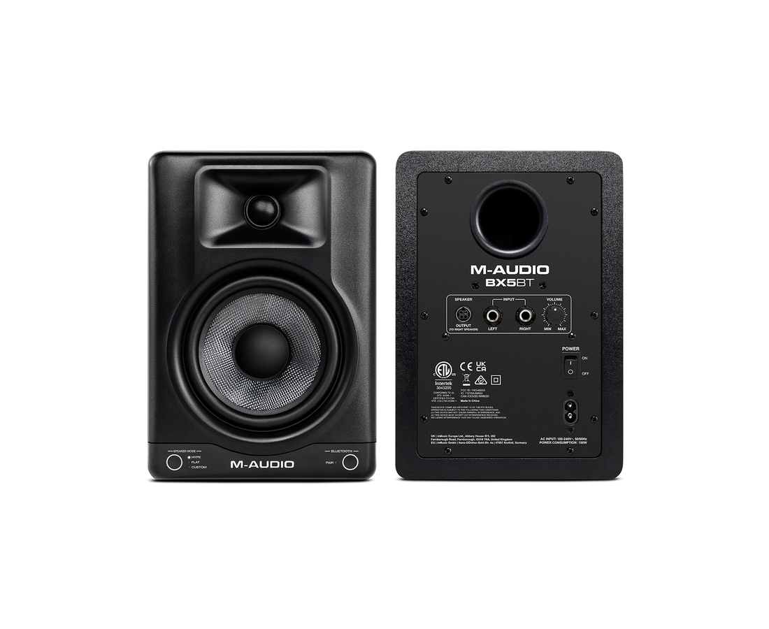 BX5 BT Bluetooth-мультимедийные мониторы (пара). 120 Вт. (2 x 40 Вт НЧ-динамика, 2 x 20 Вт ВЧ-динамика, усиление класса D) двухполосного усиления, 5-дюймовый кевларовый динамик и прецизионный кроссовер на базе DSP обеспечивают кристально чистый звук с глубокими басами. Пользователи могут легко переключаться между референсным режимом FLAT и улучшенным режимом HYPE с помощью элементов управления на передней панели или погрузиться в глубокую настройку с помощью приложения M-Audio Studio Control, которое обеспечивает доступ к пятиполосному эквалайзеру и пользовательским предустановкам. Встроенное подключение Bluetooth 5.3 обеспечивает беспроводную потоковую передачу с любого устройства и из любого приложения.