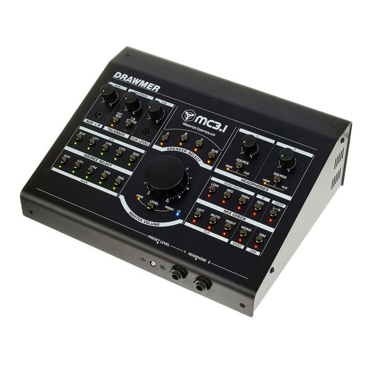 Drawmer MC 3.1, Monitor controller, Can control up to three pairs of speakers, a subwoofer, two headphones, Inputs, 4x XLR / Combi, 1x Stereo RCA, 1x 6,3 mm mini-jack, 1x Digital AES/SPDIF, outputs 6 XLR for monitors, mono XLR output for subwoofer, talkback input, dimensions 220 x 275 x 100 mm, Weight 2,5 Kg,