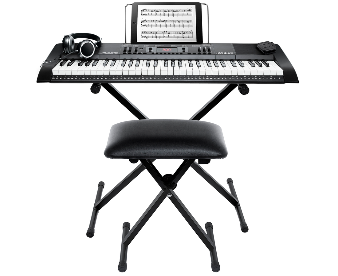 HARMONY 61 MK3 комплект: синтезатор с 61 клавишами, наушники, педаль сустейна, подставка для клавиатуры и скамья в комплекте. Встроенные динамики и 300 высококачественных встроенных звуков, режимы DUAL, SPLIT, ЗАПИСЬ, 40 встроенных демонстрационных песен и 300 встроенных ритмов аккомпанемента Alesis