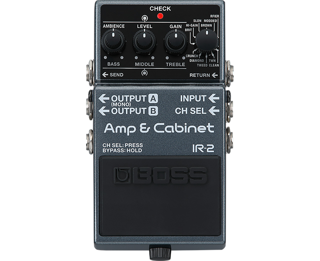 BOSS IR-2 — компактный эмулятор усилителя и загрузчик IR кабинетов; 11 усилителей и 11 IR от Celestion; 32-битная обработка, 96 кГц; поддержка пользовательских IR (до 11 слотов); регуляторы Gain, Bass, Middle, Treble, Level, Ambience; вход моно, выход стерео; стереопетля эффектов; выход на наушники; USB-C для записи и загрузки IR; питание от батареи 9В или адаптера; размеры 73×129×59 мм; вес 450 г.