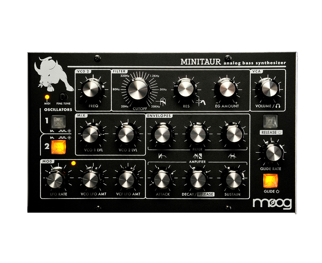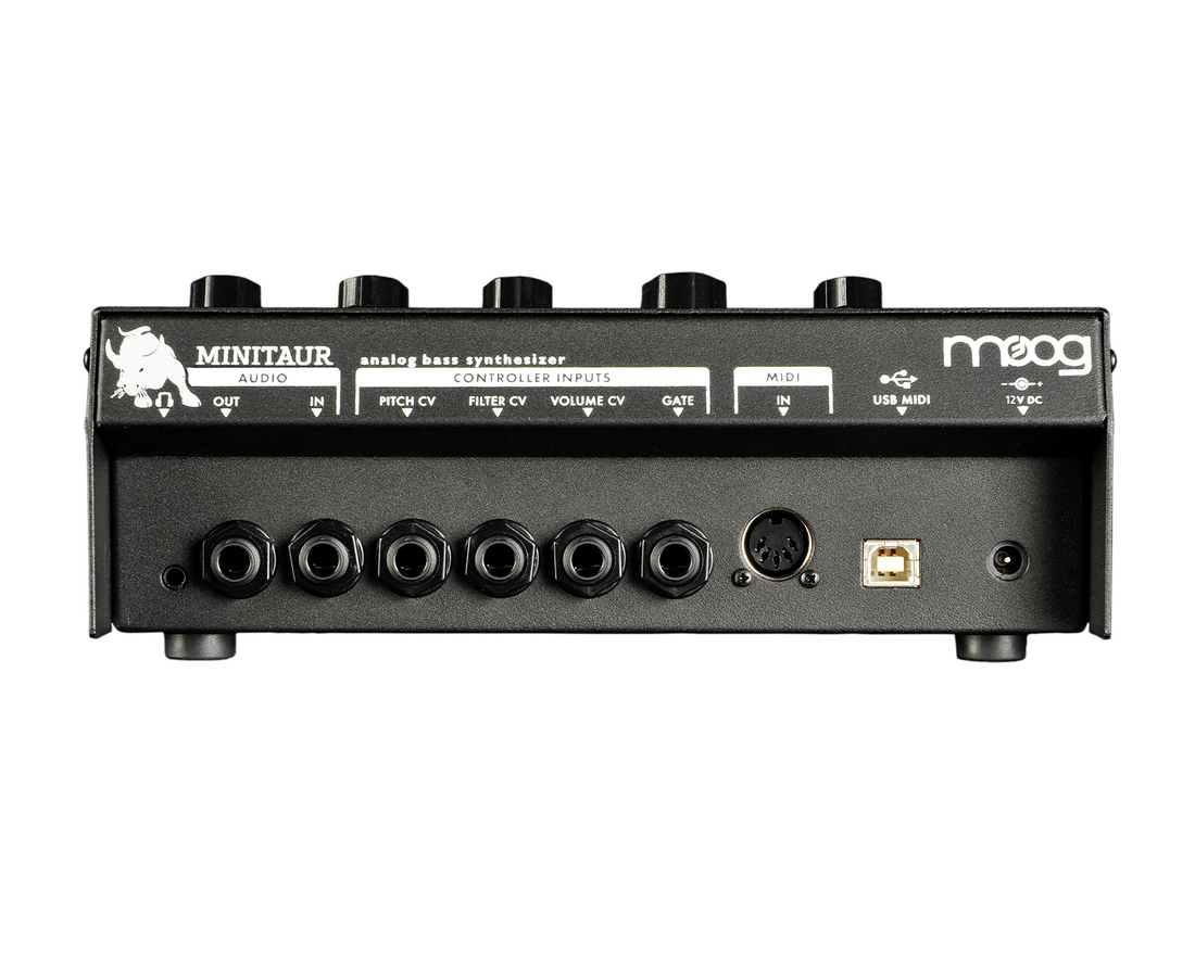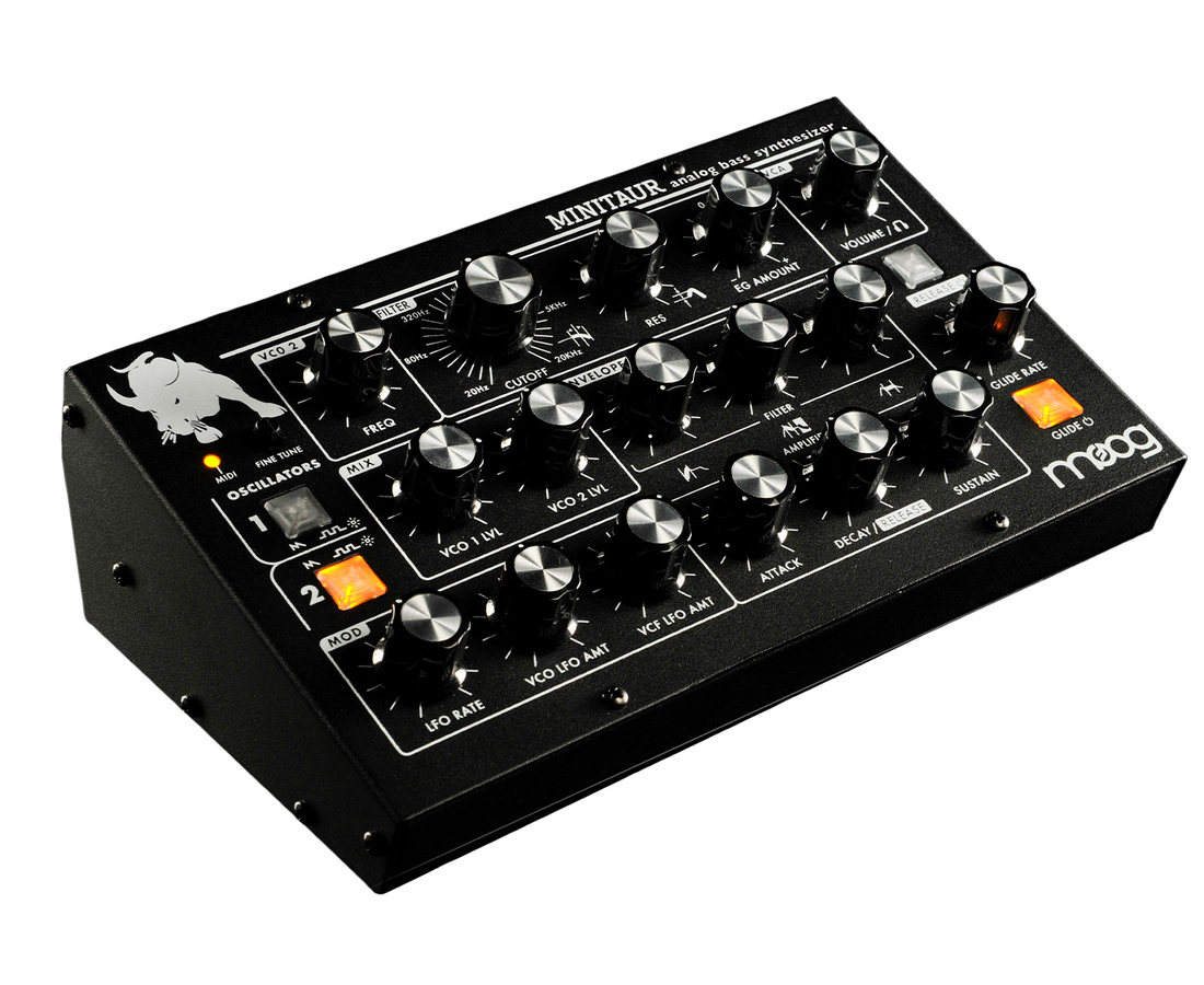 Moog Minitaur - Аналоговый монофонический синтезатор; 2 осциллятора (Saw, Square); Hard Sync; Диапазон осцилляторов 22 Гц – 6.8 кГц; Moog Ladder-фильтр 20 Гц – 20 кГц; 2 ADSR-огибающие; LFO (Tri, Square, Saw, Ramp, S&H); Glide (LCR, LCT, EXP); Аудиовход ¼" TS; Аудиовыход ¼" TS + ⅛" TRS (наушники); USB/MIDI DIN; CV входы (Pitch, Filter, Volume, Gate); CV–MIDI конвертер; 128 пресетов; Питание 12V DC; Вес 1.2 кг; Размеры: 222×130×79 мм