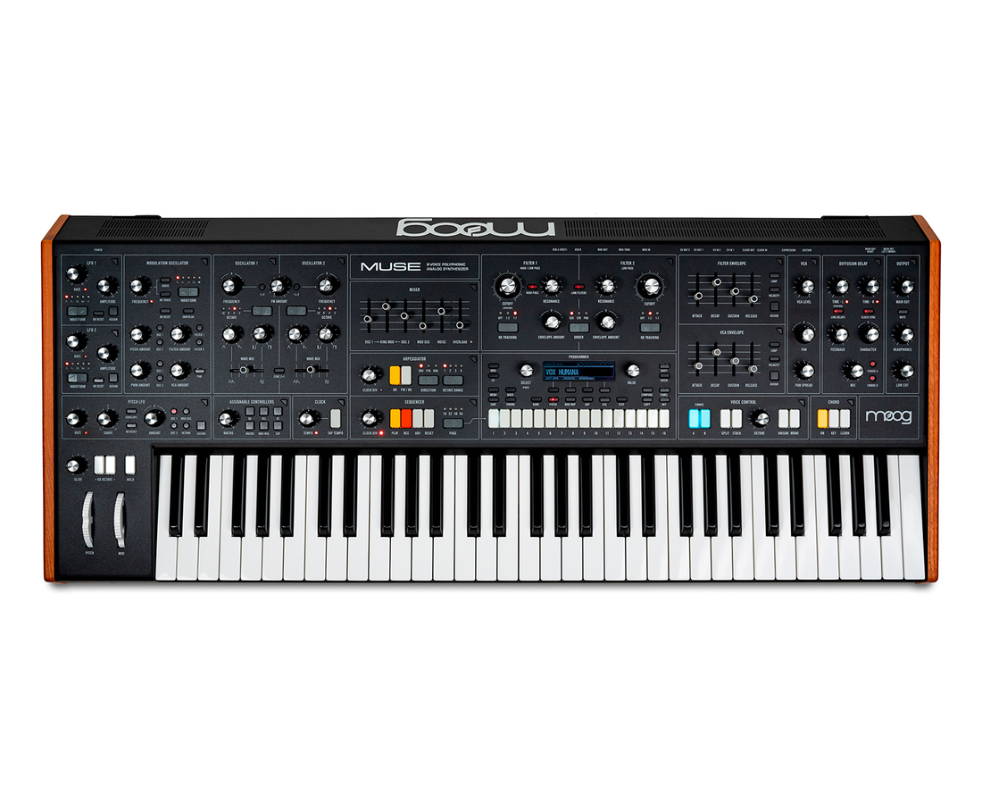 Moog Muse — 8-голосный би-тембральный аналоговый синтезатор; 61 клавиша Fatar (velocity, aftertouch); 2 VCO + мод. осц. на голос; Ring Mod, Noise, CP3 микшер; 2 аналоговых фильтра (HP/LP, серия/параллель); 2 ADSR с кривыми и лупом; 2 LFO, Pitch LFO, 16 мод. слотов на тембр; Diffusion Delay™; 64-шаговый секвенсор; арпеджиатор; 256 пресетов, 256 последовательностей; MIDI DIN и USB, 2x CV In/Out, Clock In/Out, педали; аудиовыходы TRS; вес — 14,5 кг