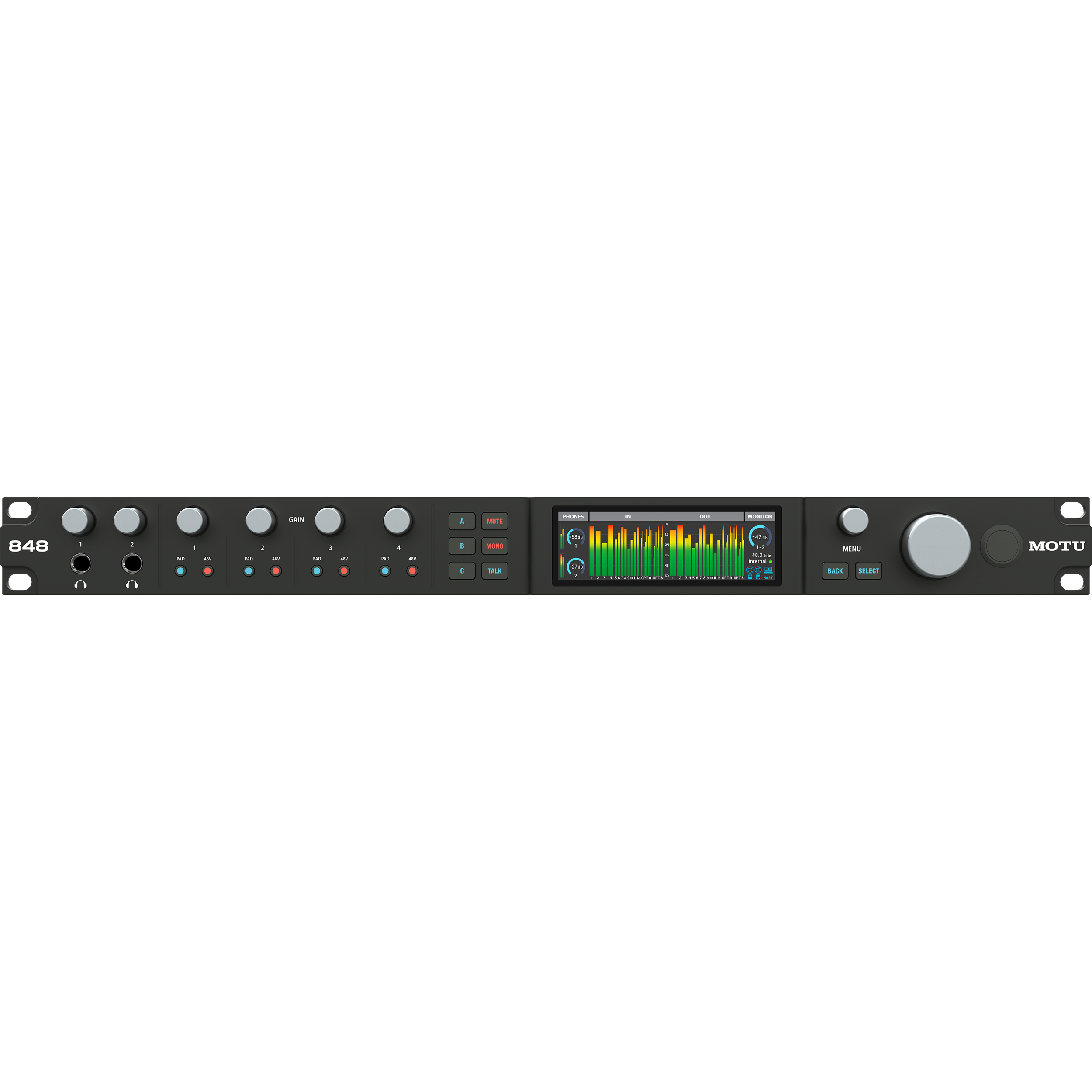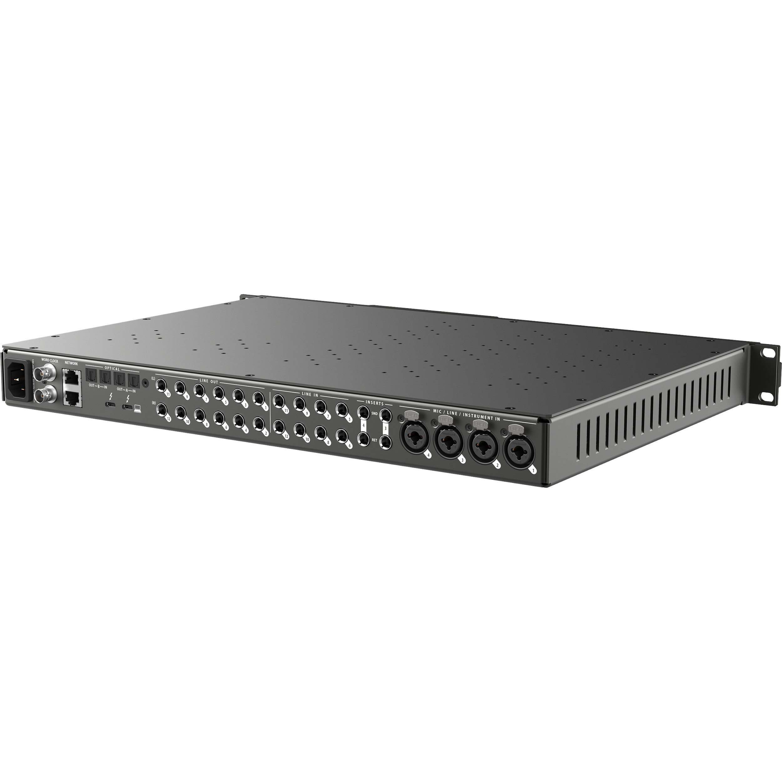 - Выходы: 12× TRS line (DC-coupled), 2× наушниковых, 2× ADAT, сетевые AVB (до 128 Out).