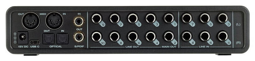 • Цифровой ввод / вывод: 1 банк (8 каналов) оптического ADAT с частотой дискретизации 1x 1 банк (4 канала) оптического кабеля SMUX с частотой дискретизации 2x Возможность переключения на стерео TOSLink (оптический S / PDIF) 1 стереофонический S / PDIF на RCA (до 96 кГц).