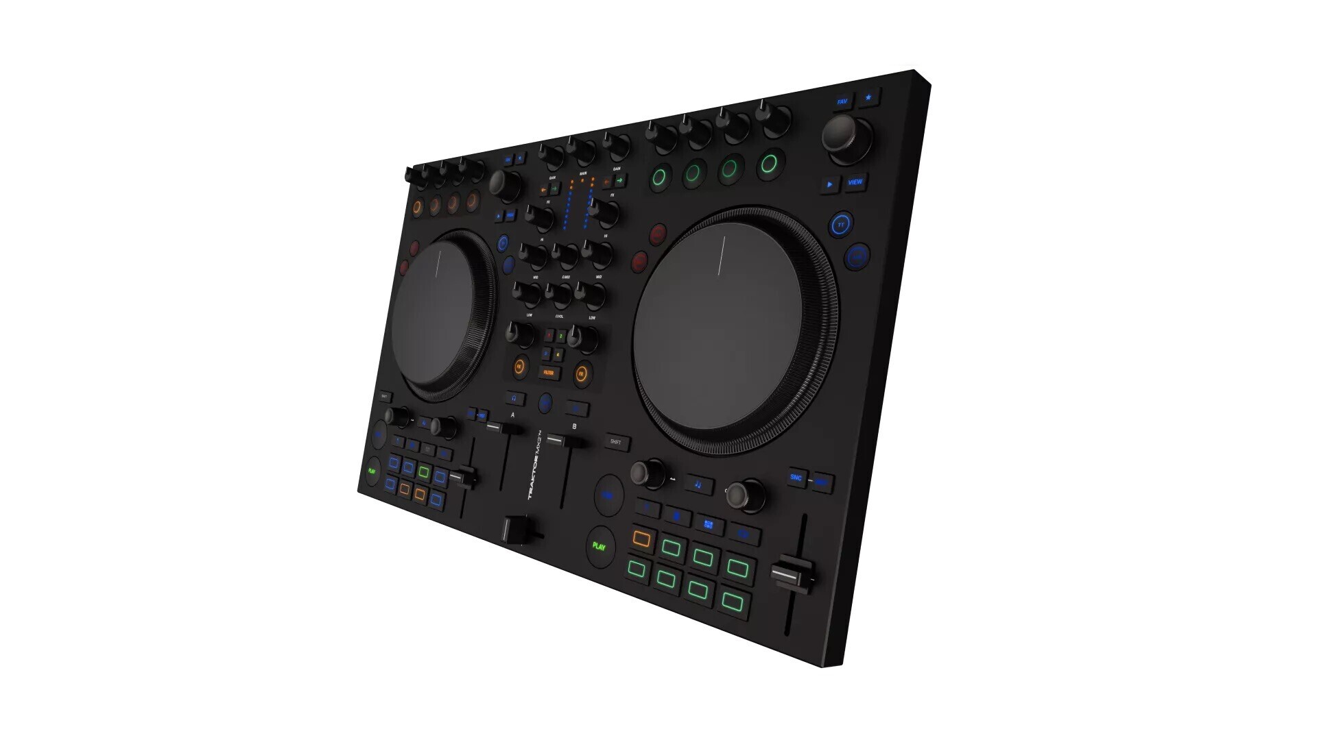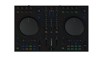 - Органы управления: 2 высокоточных сенсорных джога, 2 каналных фейдера, 1 кроссфейдер, 2 pitch‑фейдера, 2 VU‑метра, 58 подсвечиваемых кнопок, 16 RGB падов, 6 энкодеров, 21 потенциометр.
