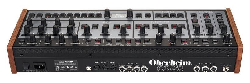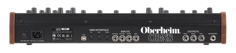 Задняя сторона девайса располагает восемью разъёмами TRS, включая выход для наушников и левого/правого/моно каналов. В свою очередь, остальные четыре входа предназначены для педалей: сустейна, громкости, фильтра и арпеджиатора. Кроме этого, предусмотрены MIDI IN/OUT/THRU и порт USB. Помимо прочего, OB-X8 имеет универсальный внутренний блок питания и может получать питание от сети через стандартную розетку IEC.