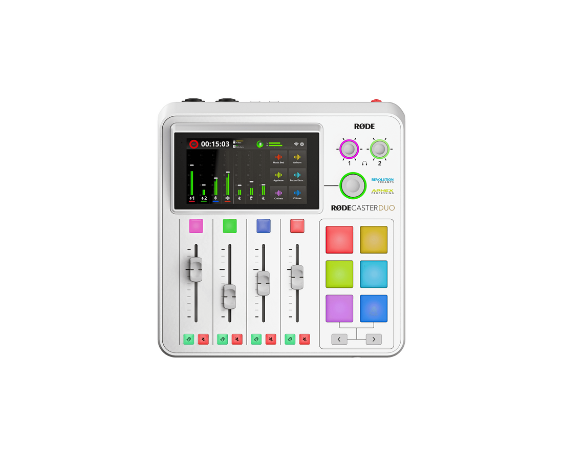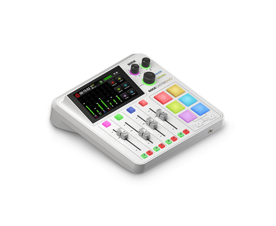 RØDECaster Duo — компактная интегрированная студия звукозаписи для подкастеров, стримеров и контент-мейкеров, сочетающая в себе профессиональное качество звука, гибкость и простоту управления. Оснащён двумя ультратихими предусилителями Revolution Preamps (шум -131.5 дБV EIN, усиление до 76 дБ), двумя комбинированными входами Neutrik для микрофонов, инструментов и линейных сигналов, а также встроенным приёмником для беспроводных систем RØDE Series IV (Wireless PRO, GO , ME).