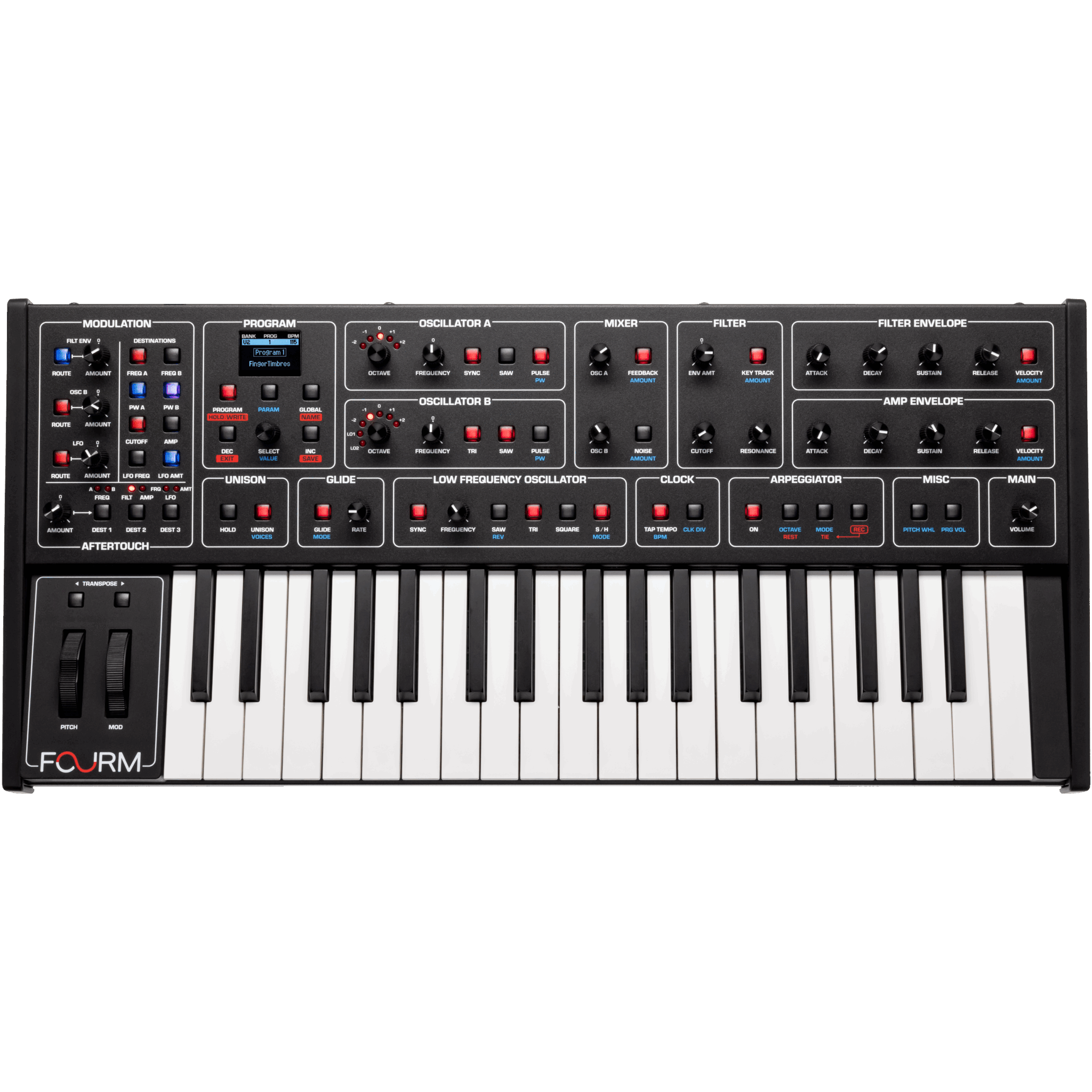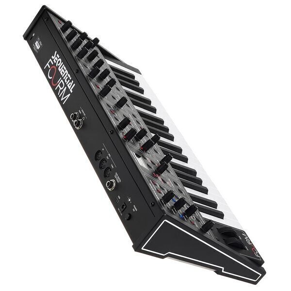 Sequential Fourm — компактный 4‑голосный аналоговый синтезатор с характерным тоном линейки Prophet и отзывчивой клавиатурой Tactive™ со слим‑клавишами и полифоническим aftertouch. Инструмент ориентирован на живую игру, экспрессивное исполнение и оперативную звуковую модификацию.