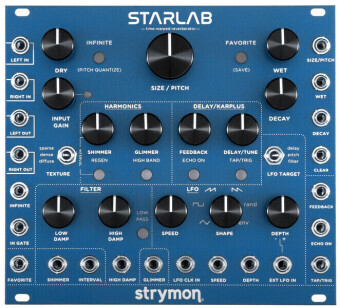 Strymon StarLab- Reverb Eurorack module- three selectable reverb types for a variety of ambient textures- Four octaves of Karplus-Strong string synthesis with attenuation control for string/verb- LFO section: Various waveforms to modulate delay time, reverb size or filter- Filter section with 4-pole 24dB/octave low-pass filter with variable resonance- Harmonics section to enhance the aural spectrum of the reverb- Adjustable shimmer for additional +/- 1 octave pitch shifting of the reverb- Glimmer for dynamic enhancement of harmonics- adjustable reverb core size to increase or decrease the space for reflections, allowing for pitch control of the regenerating reverb content- Infinite freezes input signal before reverb tank- stereo inputs and extensive CV control of parameters- independent Wet and DRY level controls- front panel access to four presets- rear panel USB port (firmware updates)- 4-bit 96kHz A/D and D/A converters- analog dry signal is not converted- power consumption: 210 mA (+12 V) / 210 mA (-12 V)- width: 28 HP: depth: 41 mm