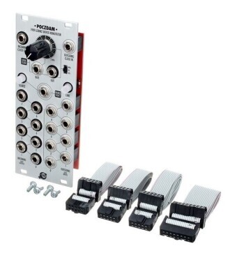 Poczdam is a binary all-round routing solution that shines alone, but especially in sophisticated Leibnitz setups. It allows for manual or voltage-controlled switching between signals, changing individual bits of the data stream, and re-clocking data using the built-in voltage-controlled wideband oscillator or an external clock signal.