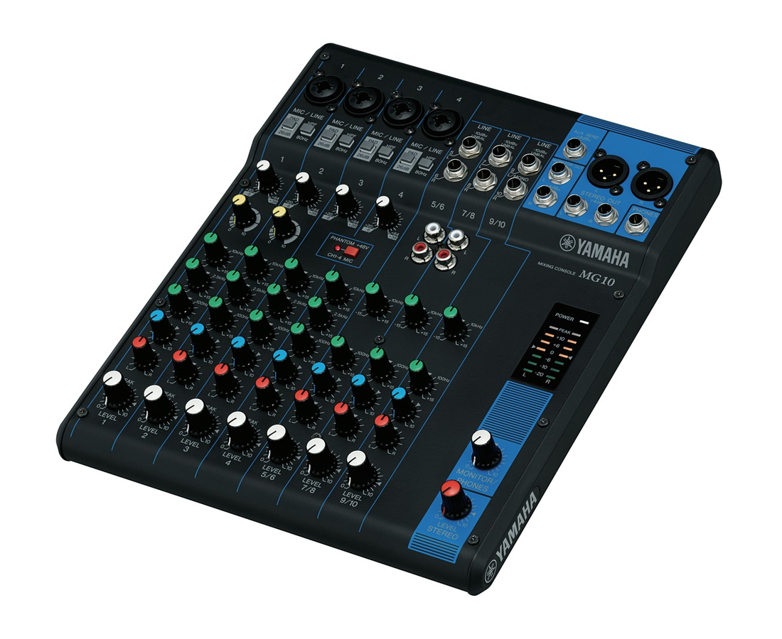 Аналоговая микшерная консоль Yamaha MG10; Макс. 4 микрофонных / 10 линейных входов (4 моно + 3 стерео); 1 стереошина; 1 шина AUX; Микрофонные предусилители «D-PRE» с инвертированной схемой Дарлингтона; Компрессоры с одним регулятором; Аттенюатор (PAD) на моновходах; Фантомное питание +48 В; Симметричные выходы XLR; Металлическая конструкция; Размеры: 244x71x294 мм; Вес: 1,9 кг; Производство: Малайзия