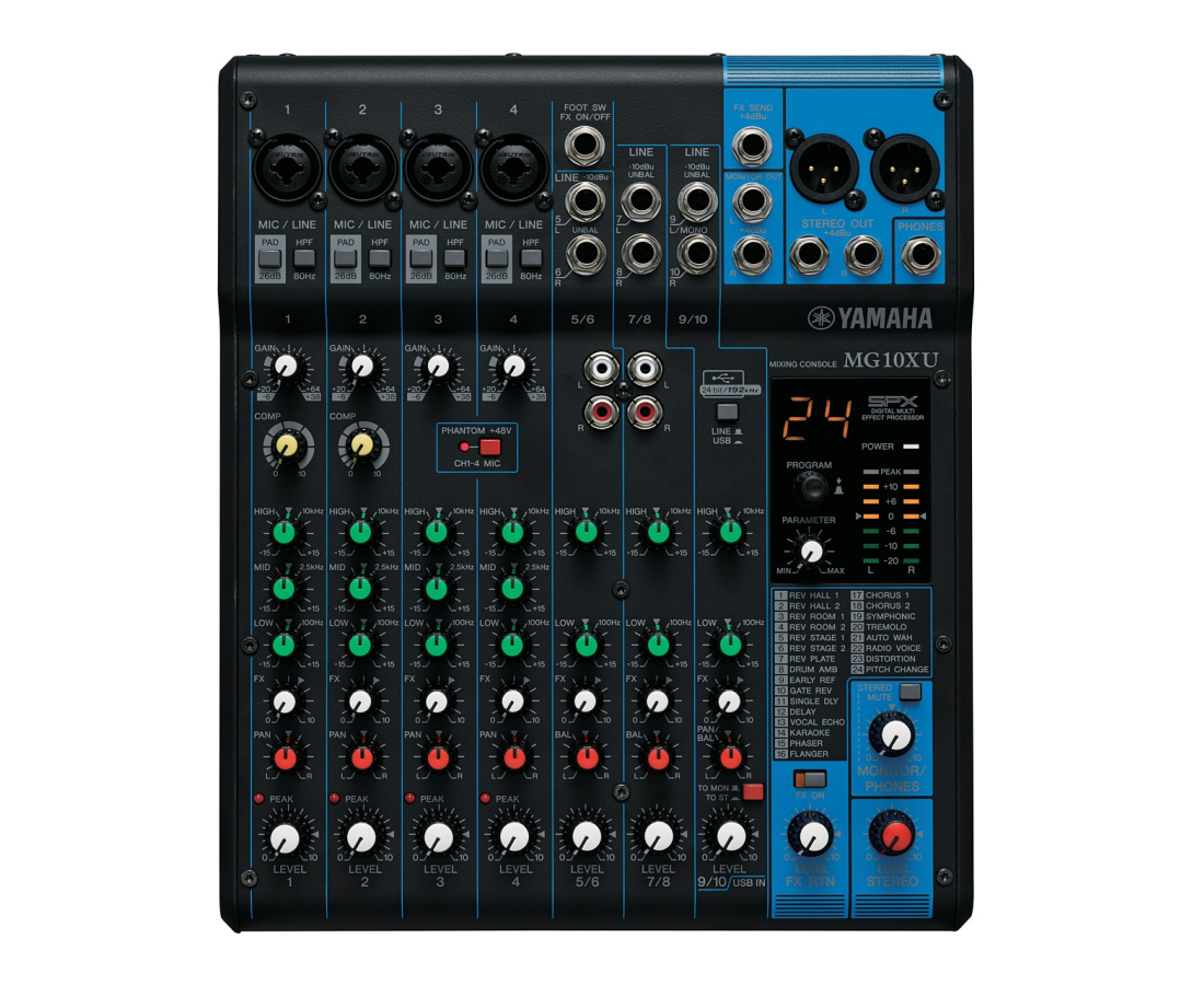Аналоговая микшерная консоль Yamaha MG10XU; Макс. 4 микрофонных / 10 линейных входов (4 моно + 3 стерео); 1 стереошина; 1 шина AUX (вкл. FX); Микрофонные предусилители «D-PRE» с инвертированной схемой Дарлингтона; Высококачественные эффекты SPX с 24 программами; Интерфейс USB Audio, 2 входа/2 выхода 24 бит/192 кГц; В комплекте ПО Cubase AI, версия для загрузки; Симметричные выходы XLR; Металлическая конструкция; Размеры: 244x71x294 мм; Вес: 2,1 кг; Производство: Малайзия